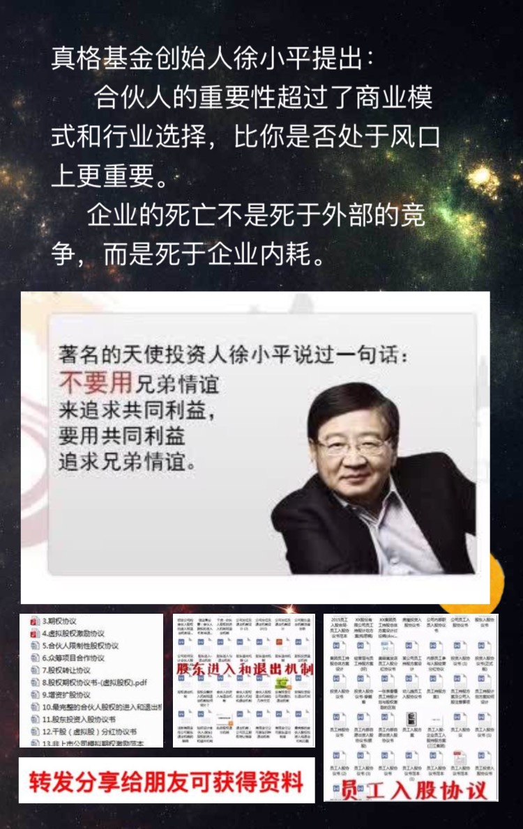 未来不再有公司,只有平台; 未来没有老板,只有创业领袖; 未来不会有员工,只有合伙人。 如今单打独斗的年代已经过去了,现在的年代是合伙制的年代,赚小钱靠个人,赚大钱靠团队,股权分配、股权激励、股权融资是企业的一次深刻变革。 ----李克强